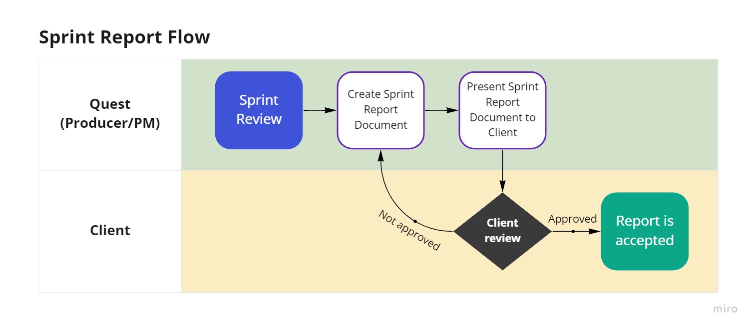 Sprint Report is done every 2 weeks. From this sprint report, Producer and/or PM are expected to create a report document for client consumption. Producer then deliver the report to client. Client can either approve or deny our report.