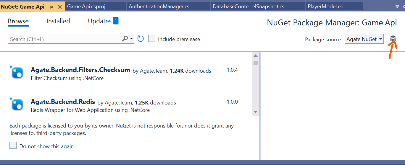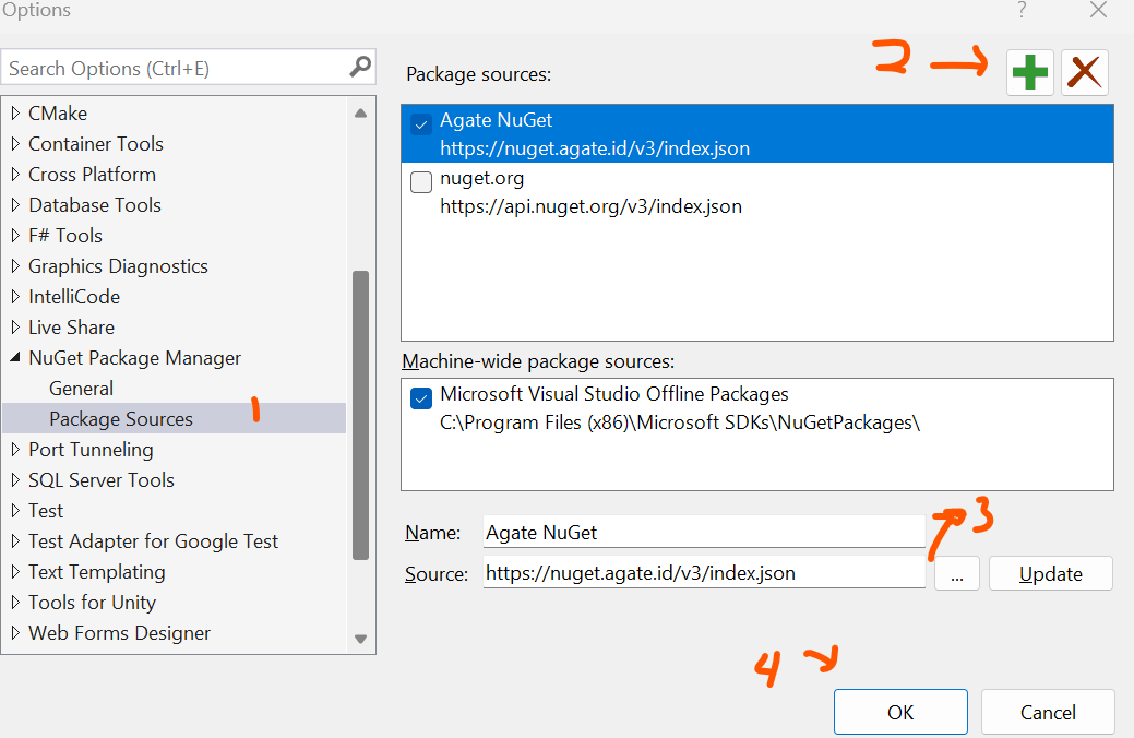 <?xml version="1.0" encoding="utf-8"?> <configuration> <!--... other config section--> <packageSources> <!--change url to agate feed url--> <add key="Agate NuGet" value="https://nuget-global.agate.id/v3/index.json" /> <add key="nuget.org" value="https://api.nuget.org/v3/index.json" /> </packageSources> <!--... other config section--> </configuration> -