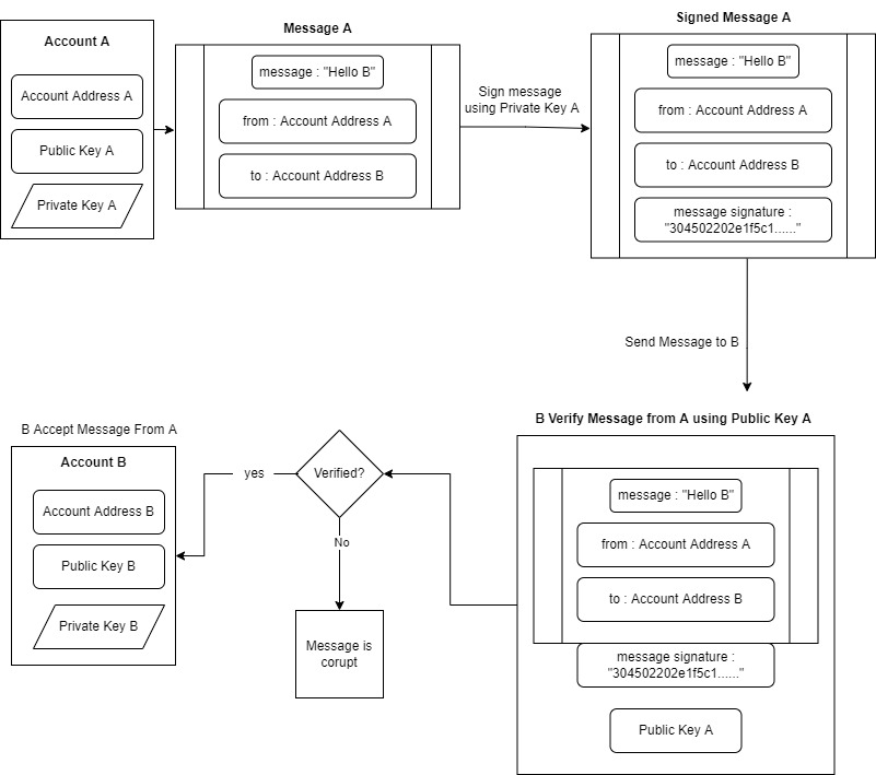 - Account A signed the message using Private Key A and Account B verify the message from A using Public Key A.