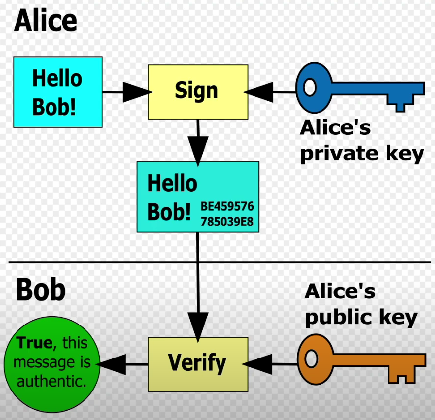 - Alice sign message using Alice’s private key and Bob verify the message using Alice’s public key