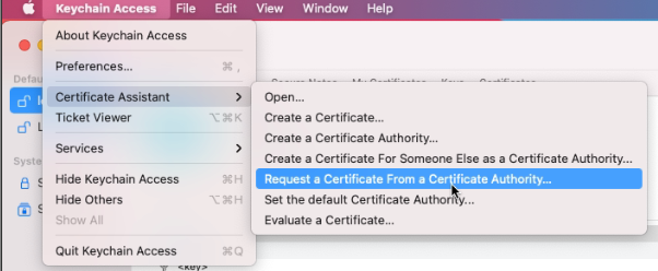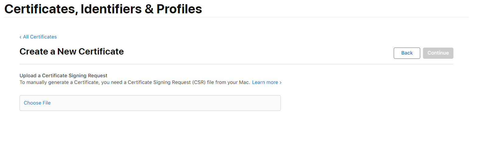 In order to create a certificate from Apple Developer Website user will need to create Certificate Signing Request (CSR). CSR can be created through Keychain Access App which should come built in in any mac machine.