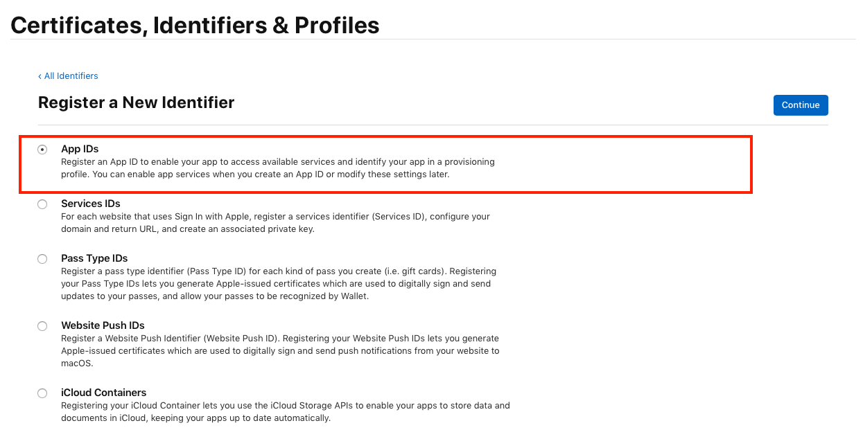Click on Identifier Section and click (+) then select App IDs and select continue