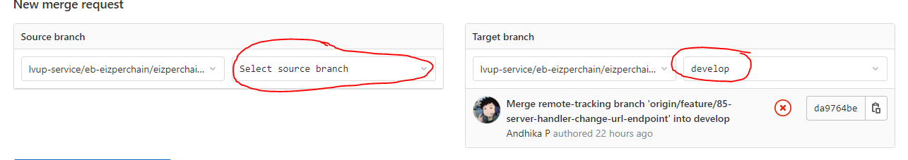 - Set Source branch to which branch you want to work from (set develop by default)
