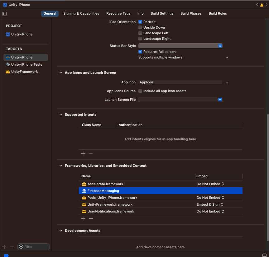 In TARGETS → Unity-iPhone → General → Frameworks, Libraries, and Embedded Content, check if FirebaseMessaging exist, if exist please skip to step 6 , if not please follow the next step.