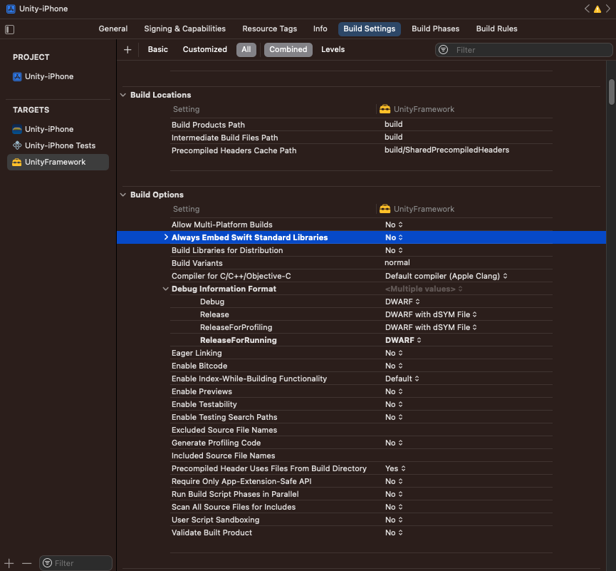 In TARGETS → UnityFramework → Build Settings → Build Option, in “Always Embed Swift Standard Libraries” select No.
