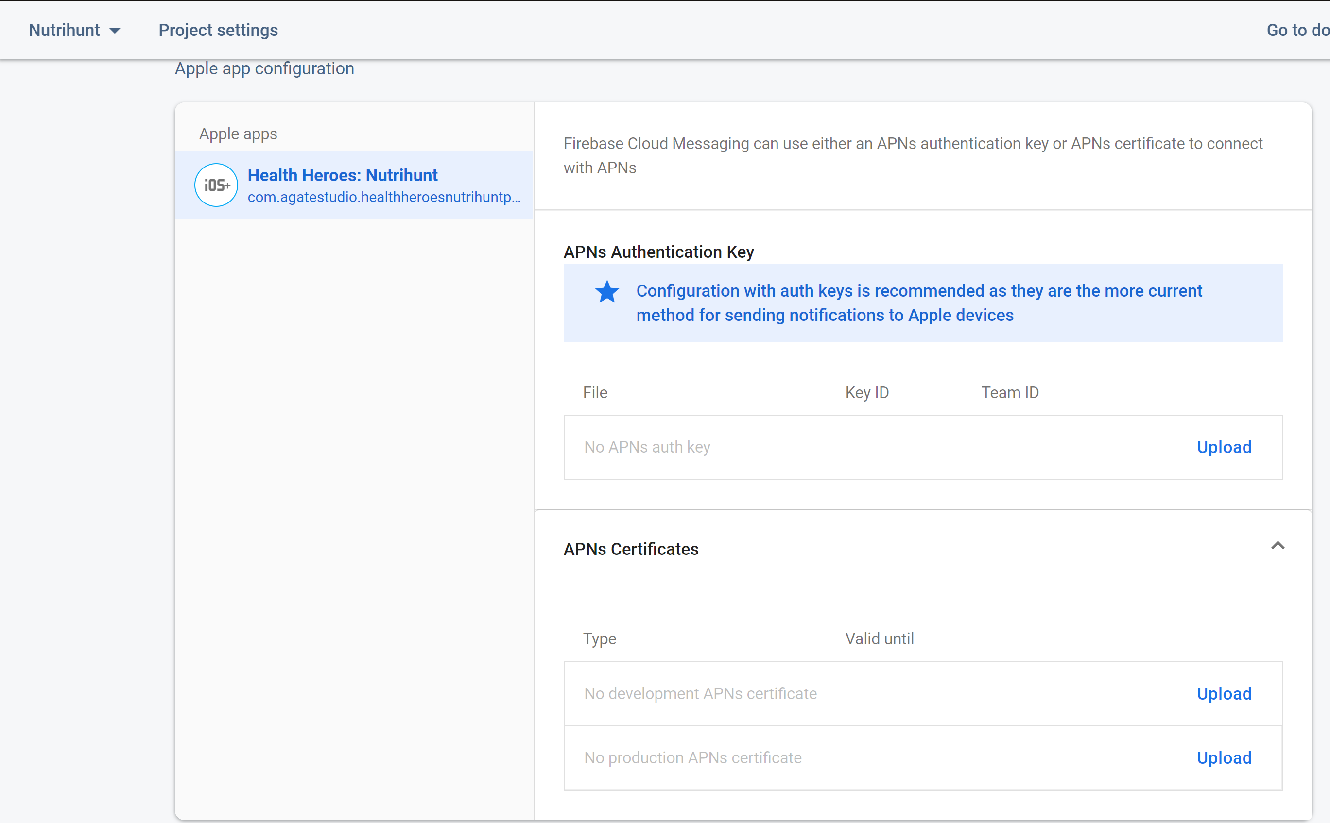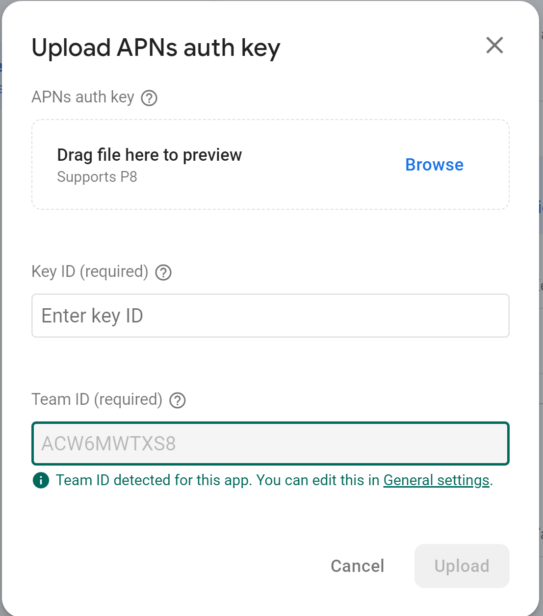 Insert your APNs auth key, Key ID and Team Id (you can create and download it on https://developer.apple.com/account in Certificates, Identifiers & Profiles section. Or ask Tech Department for APNs auth key). After you input all the required data, press Upload.