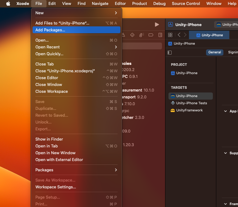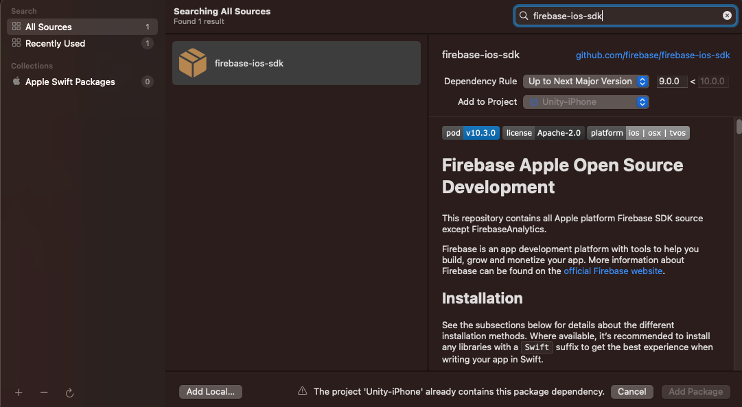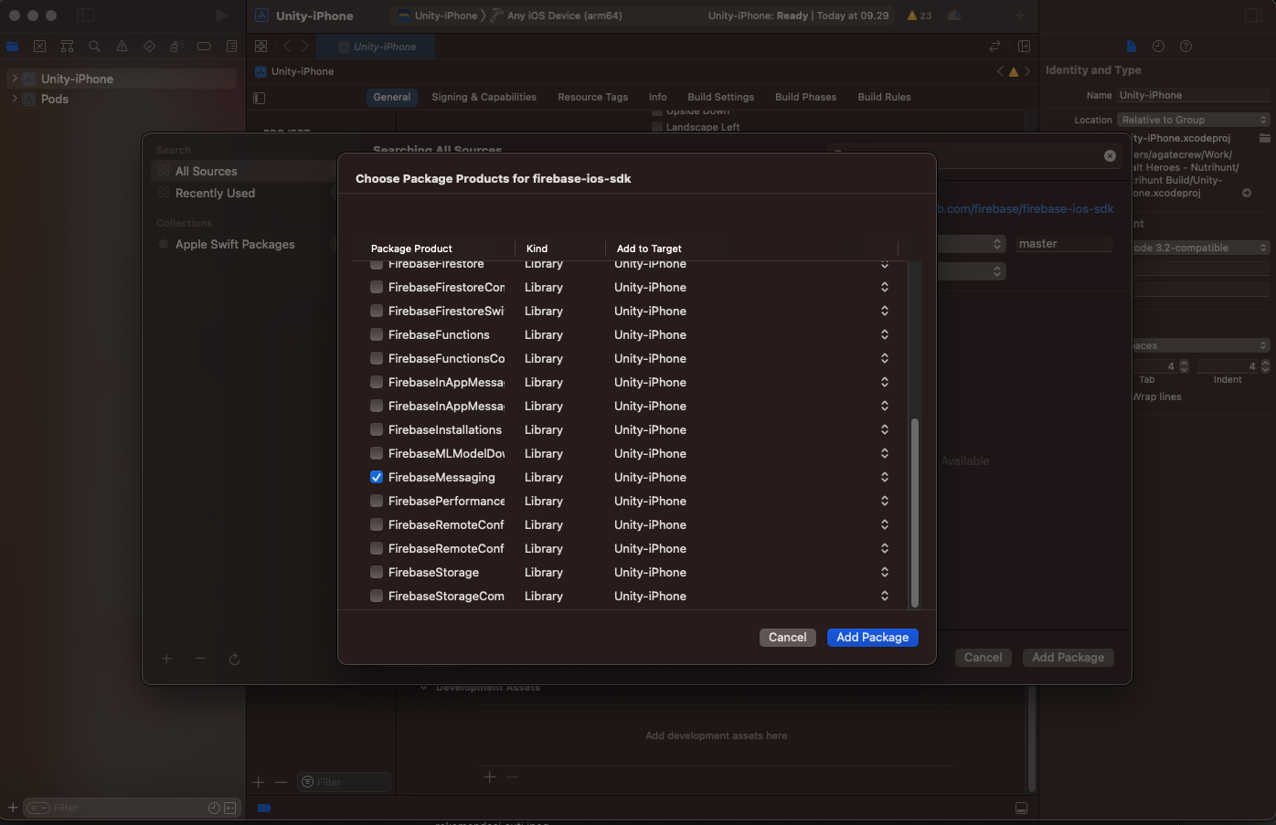 Search firebase-ios-sdk in search bar, or insert the repository URL for Firebase (https://github.com/firebase/firebase-ios-sdk). Next in Add to Project section, select Unity-iPhone, select Add Packages in bottom right corner.