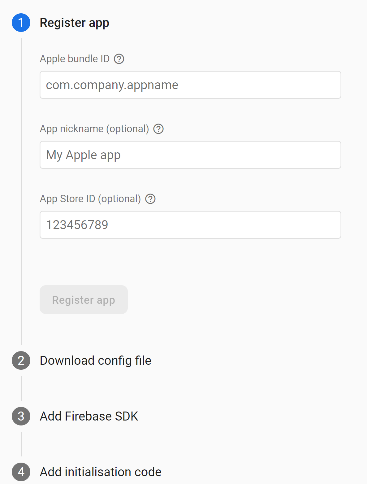 In Apple Bundle Id, insert your bundle Id project (it’s recommend to use the same bundle Id name as in your Android app build), after register your app, follow the rest of the instruction given by Firebase.