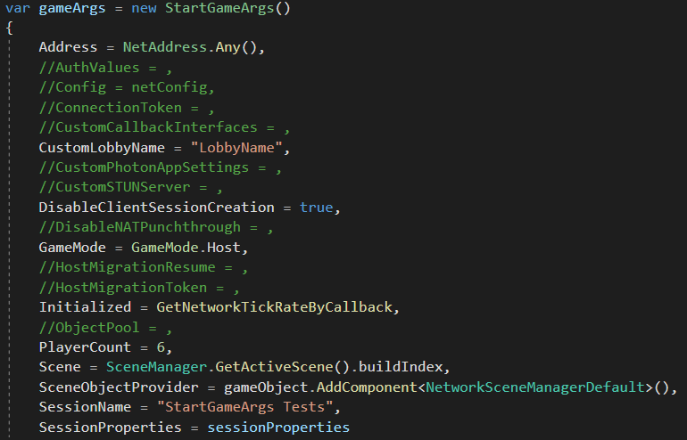 StartGameArgs, a struct class that is passed to the NetworkRunner when starting a room/session, has multiple public attributes that each can be specified to start with custom configuration(s).