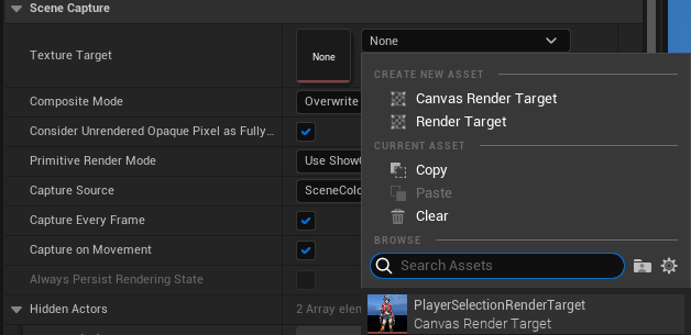Then assign/add a Canvas Render Target into the SceneCapture2Dโs target texture. โ ๏ธ Note that to hide the background, the Canvas Render Target need to have alpha channel