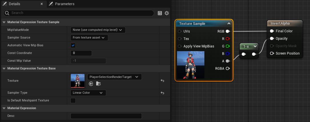 At this point, the Canvas Render Target should show what the SceneCapture2D camera see, but with inverted alpha channel (only the background is shown but the 3D object itself become transparent.