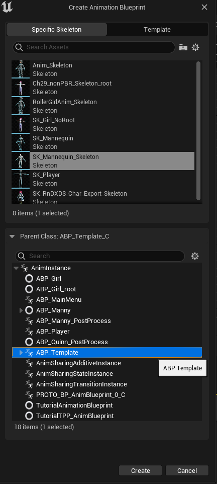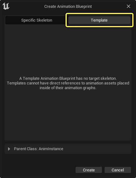 To (re)use the template animation blueprint above, create new AnimBP with AnimInstance set to the template above.