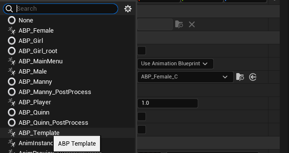 In the diagram above, MaleAnimBP and FemaleAnimBP are Animation Blueprints which are parented to the AnimBPTemplate, and hold the animation clips which will be used by the Player, while the AnimBPTemplate is where the animation logics are defined.
