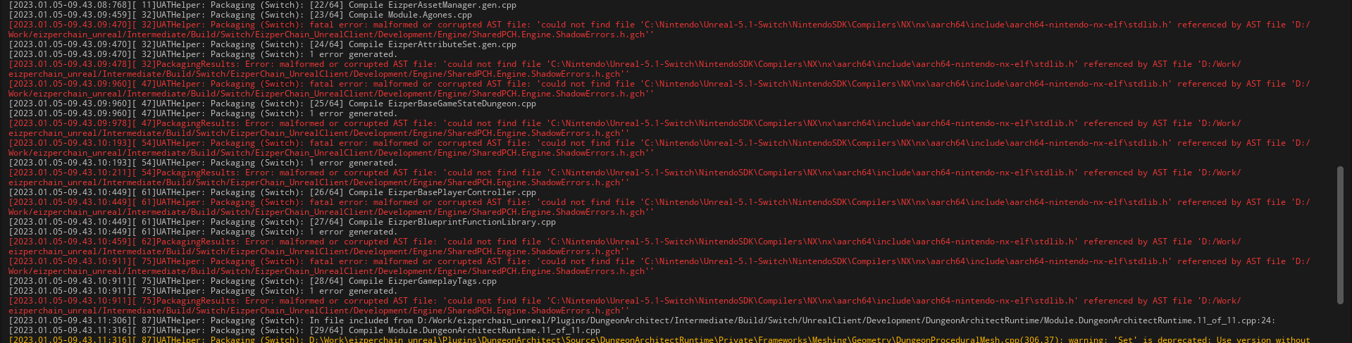 [2023.01.05-09.43.10:911][ 75]PackagingResults: Error: malformed or corrupted AST file: 'could not find file 'C:\Nintendo\Unreal-5.1-Switch\NintendoSDK\Compilers\NX\nx\aarch64\include\aarch64-nintendo-nx-elf\stdlib.h' referenced by AST file 'D:/Work/eizperchain_unreal/Intermediate/Build/Switch/EizperChain_UnrealClient/Development/Engine/SharedPCH.Engine.ShadowErrors.h.gch''