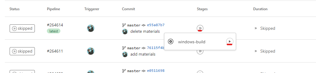 There’s list all of commit’s pushed to the project. At your commit, you will see ‘>>’ symbol at Stages, click it. You’ll see list of pipelines stages (at this point only windows-build just like on our .gitlab-ci.yaml script, *may add another build platform later). Run the automation build with click the play button at windows-build stages.