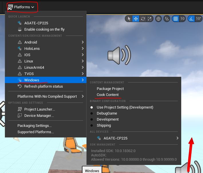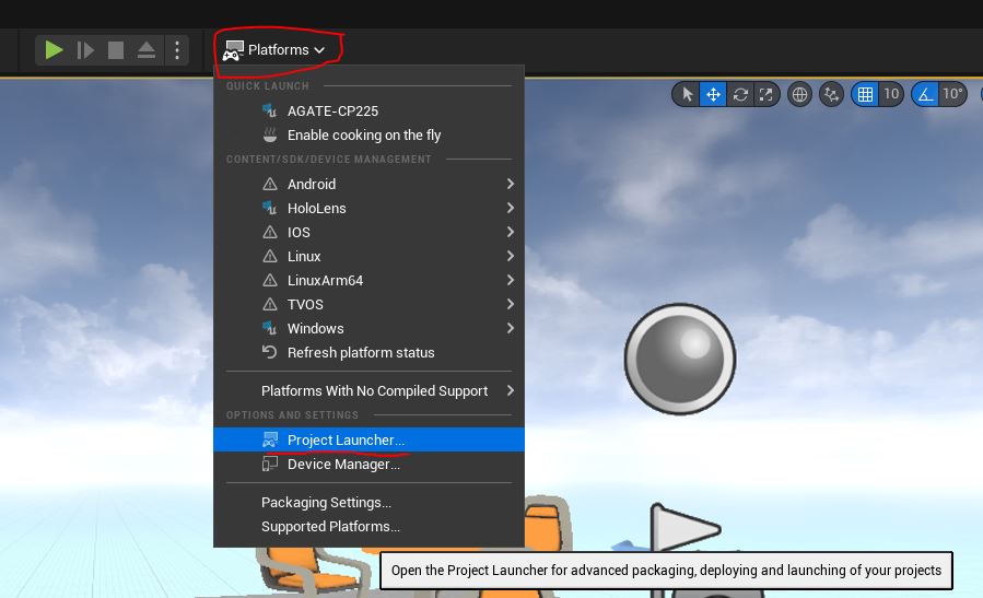 Using the Platforms button in the main toolbar enables you to quickly test your project with a single click by building and deploying the currently loaded level for testing.