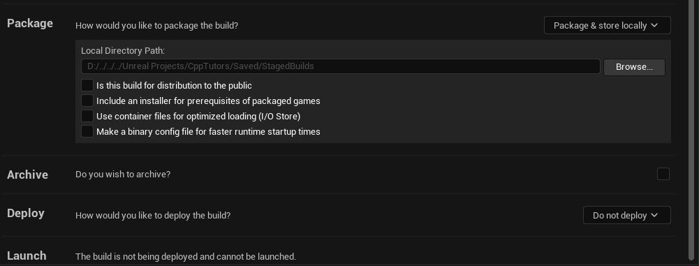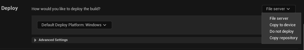 At deploy, for testing purpose you can simply leave it Do not deploy, but if you want to deploy the project, you can check the detail at [Deploys](Unreal Engine 5 Build Operations 7860d2fed8f2484aa7c7afd641e1594d.md) section.