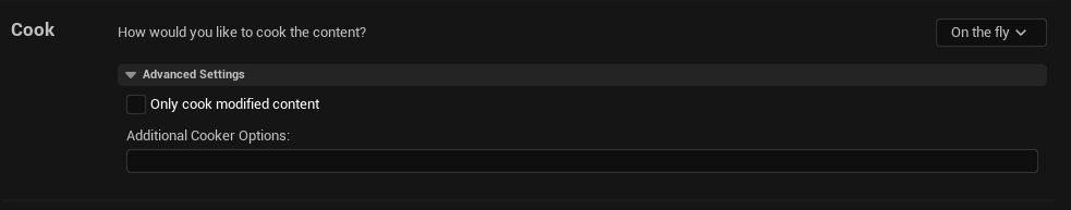 To access this cook mode, follow the step on creating Custom Profiles at Project Launcher here [Project Launcher in Unreal Editor](Unreal Engine 5 Build Operations 7860d2fed8f2484aa7c7afd641e1594d.md).