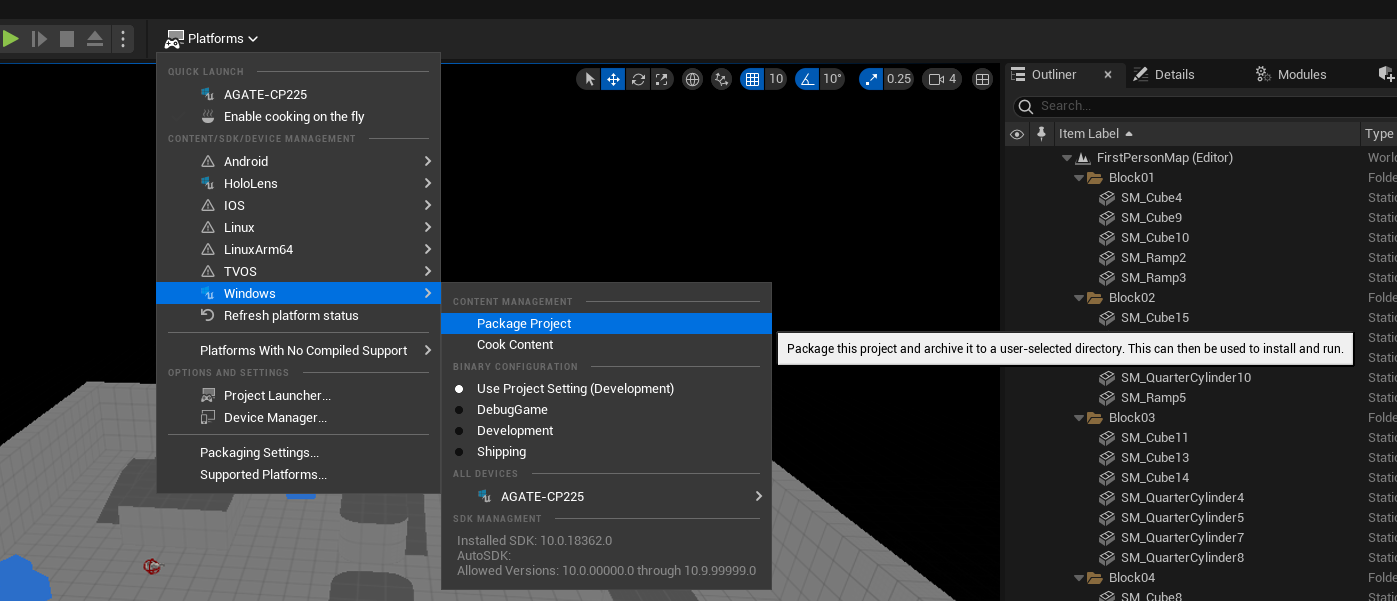 Use the drop-down arrow next to the Selected Platform button to package the project.