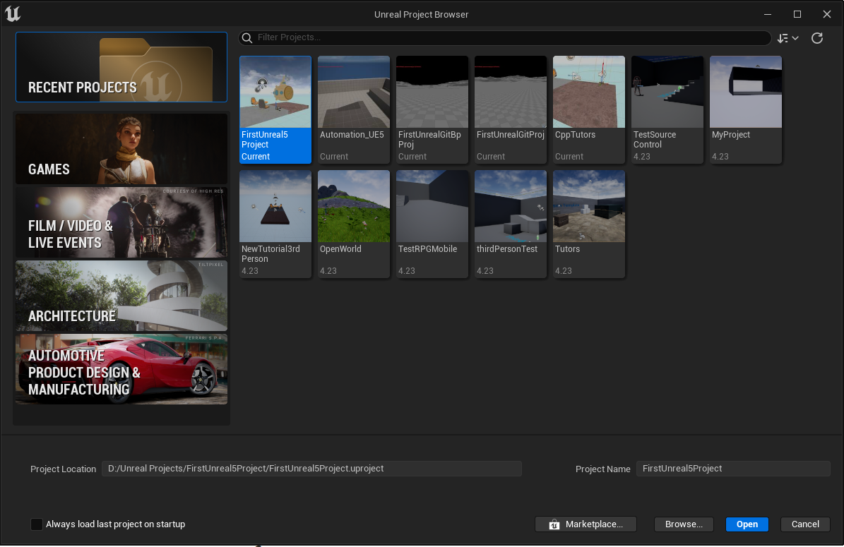 Once the Unreal Project Browser show up, at Games section, select one of game template or just select ‘Blank’.