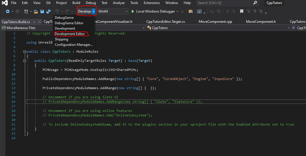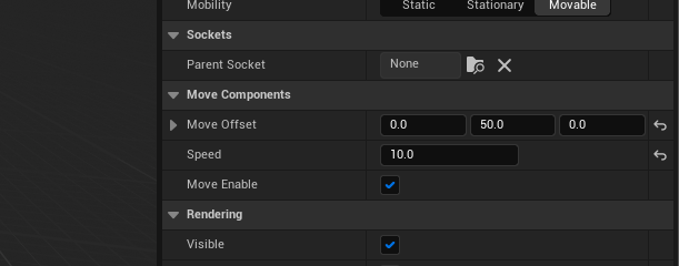 MoveComponents.hadd script to define parameter:private: // Parameter UPROPERTY(EditAnywhere) FVector MoveOffset; UPROPERTY(EditAnywhere) float Speed = 1.0f; UPROPERTY(EditAnywhere) bool MoveEnable = true; // Computed locations FVector StartRelativeLocation; FVector MoveOffsetNorm; float MaxDistance = 0.0f; float CurDistance = 0.0f; int MoveDirection = 1; -