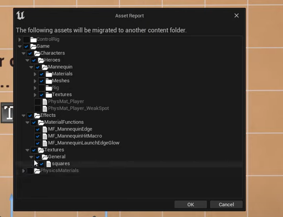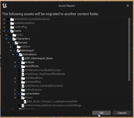 Content>Characters>Heroes>Mannequin>Animationsselect Actions, AimOffsets and Locomotion folder. Right-click and select Migrate.At Asset Report dialog, you can disable unused Asset List, just like image below.