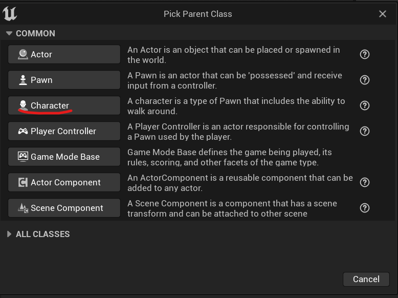 At Content folder / anywhere in Content Browser, Right click → Blueprint Class. Select Character.