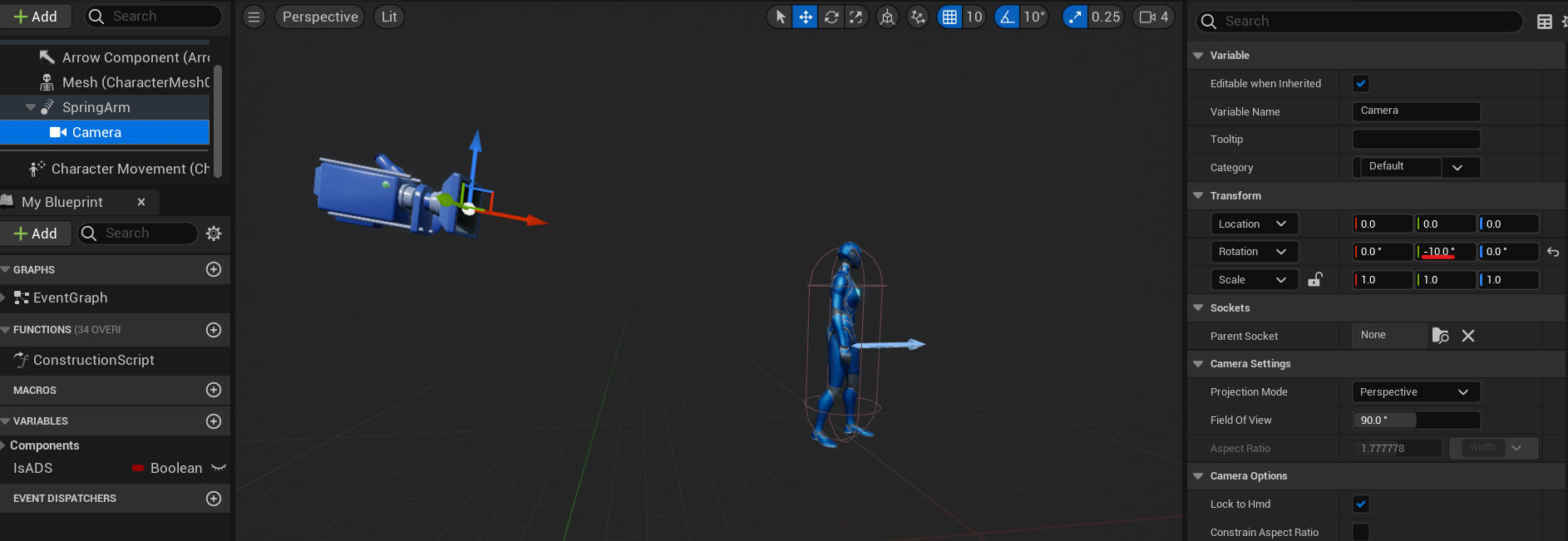 Then add new Components “SpringArm” & “Camera”, SpringArm is used to maintain camera to keep follow your character and will automatically be a parent of your Camera component.