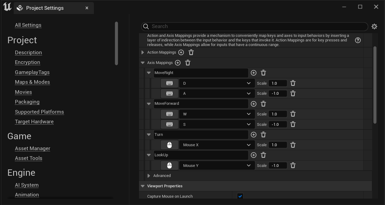 Let’s set input axis mapping for character movement, open Edit > Project Setting. Go to Engine > Input, at Axis Mappings, add key mapping like image below.