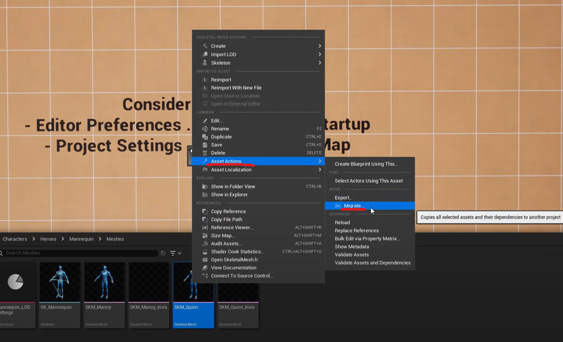 Content>Characters>Heroes>Mannequin>Meshesright-click on SKM_Quinn / SKM_Manny (character mesh), go to Asset Actions → Migrate.At Asset Report dialog, you can disable unused Asset List, just like image below.