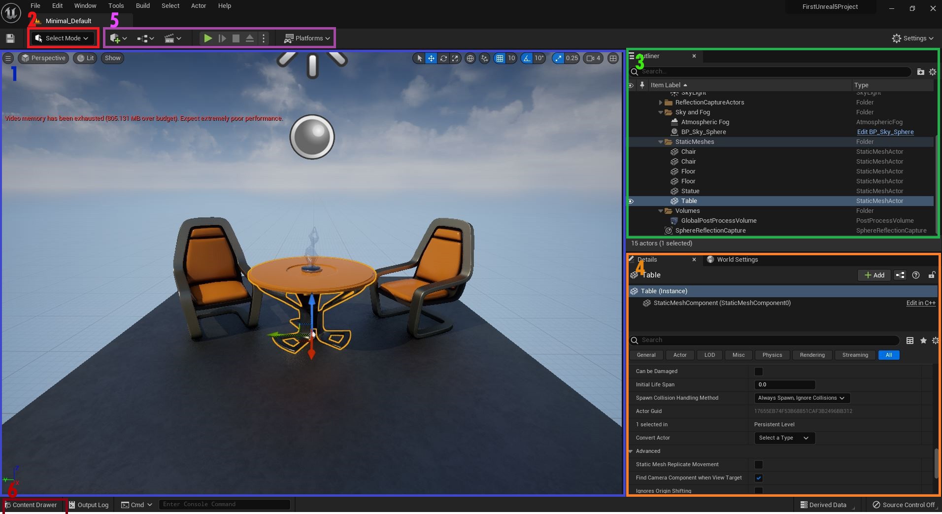 World Outliner: Displays all the objects in the current level. You can organize the list by putting related items into folders, and you can search and filter by type.