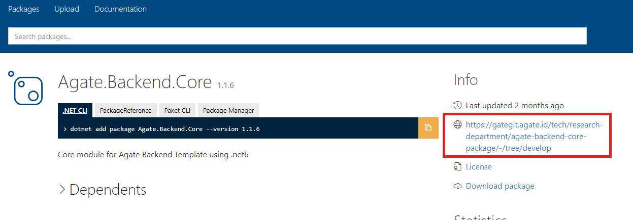 .nupkgfile into Agate Nuget with command:dotnet nuget push -s https://nuget-global.agate.id/v3/index.json -k <NUGET-SERVER-KEY> Agate.Netcore.MySql.Repository.Core.1.0.2.nupkg