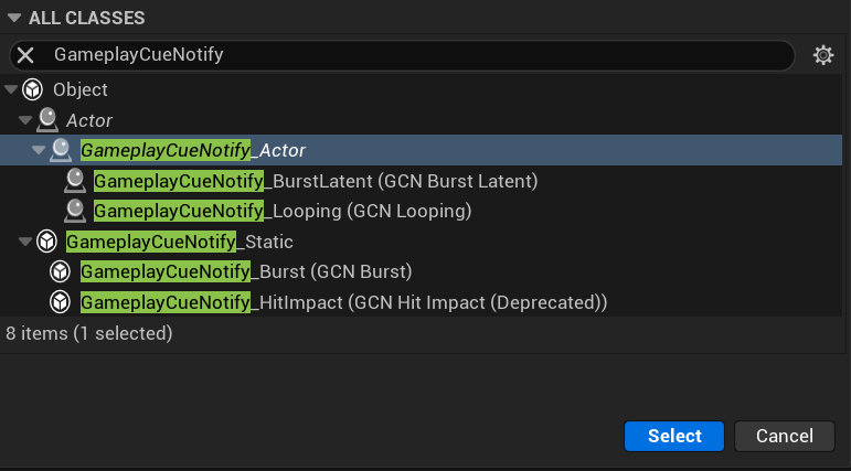 - Create Blueprint Class derived from GameplayCueNotify_Actor, you could find the difference between Static and Actor from documentation link above. And let's name it GC_Burn.