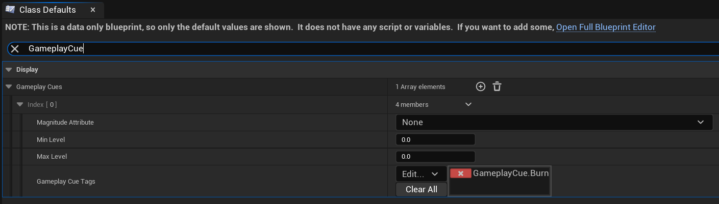 - Let's back to GE_Burn, search GameplayCue, and add GameplayCue.Burn tag there.